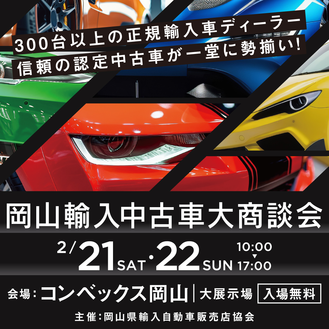 information 2026-02-06 HUWniwa 岡山輸入車大商談会 ツイート シェア はてブ Google+ Pocket 岡山輸入車大商談会 岡山輸入車大商談会 に出店します! 📍会場:コンベックス岡山 🗓開催日:2026年2月21日(土)・22日(日) ⏰時間:両日ともに 10:00〜17:00 話題の輸入車から気になる1台まで、 「見て・聞いて・相談できる」2日間🚘✨輸入車をご検討中の方も、ちょっと見てみたい方も大歓迎です🙌 ぜひ会場でお会いしましょう! ご来場お待ちしております😊 ツイート シェア はてブ Google+ Pocket feedly